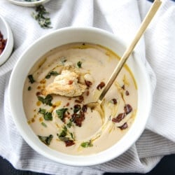 Creamy Roasted Garlic Potato Soup with Crispy Brussels + Chili Oil.