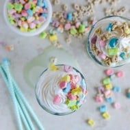 Boozy Lucky Charms Cereal Milkshakes with Marshmallow Frosting.