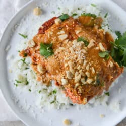Salmon with Thai-Style Curry Peanut Sauce and Coconut Cilantro Rice.