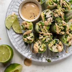 Avocado Chicken Summer Rolls with Coconut Peanut Dipping Sauce.